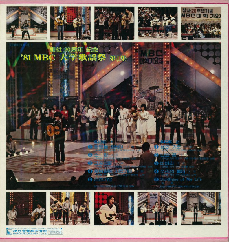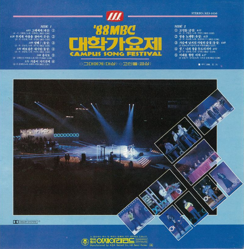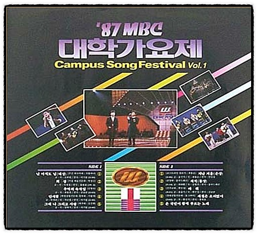 MBC 대학가요제 대상곡 모음1977.샌드페블즈 - 나 어떻해 1978.썰물 - 밀려오는 파도소리에 1979.김학래,임철우 - 내가 1980.이범용,한명훈 - 꿈의대화. 1981.정오차 - 바윗돌 1982.조정희 - 참새와허수아비 1983. 에밀레 - 그대떠난 빈들에서서 1984.이유진 - 눈물한방울로사랑은시작되고 1985.높은음자리 - 바다에 누워 1986.유열 - 지금그대로의모습으로 1987.작품하나 - 난 아직도 널 1988.무한궤도 - 그대에게 =================================================================================== |